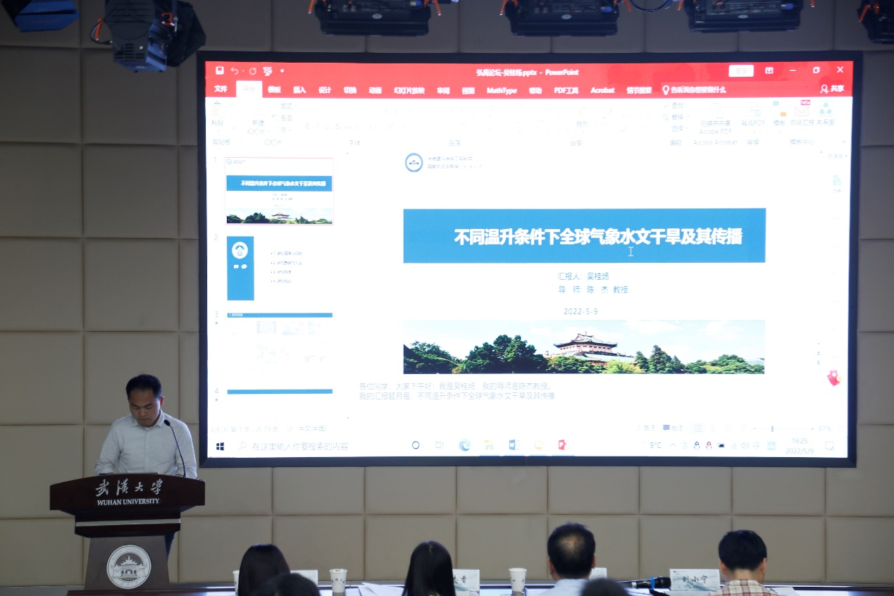 吴桂炀同学则以《不同温升条件下全球气象水文干旱及其传播》为题进行学术报告。报告提到目前已有大量研究关注气象到水文的干旱传播,以反映这两个干旱类别之间的联系并更好地理解干旱发生发展机制。全球变暖可能会改变干旱传播的特征,然而这一点尚未得到充分研究。本研究旨在研究全球8,655个流域的气象和水文干旱情势的变化,特别是在未来全球温升1.5-3.0℃条件下的气象水文干旱传播特征。研究结果显示,在未来全球气候变暖的情况下,北美洲西部、南美洲、地中海、非洲南部、东亚和澳大利亚以外的地区由于降水增加,气象和水文干旱情势(即持续时间和严重程度)都会有所缓解。然而,大多数地区的干旱情势在从气象干旱发展为水文干旱的过程中将会更加严重;一半地区在干旱传播过程中干旱情势的恶化相对历史时期将先加重,然后随着温度的上升而有所缓解。这些结果表明,减缓全球变暖的趋势可以抑制干旱情势在气象水文干旱传播过程中的恶化。