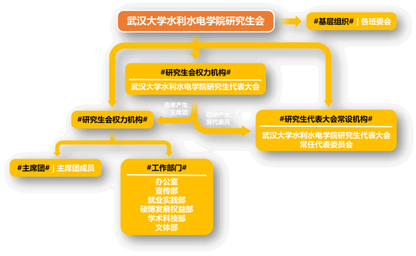 水利水电学院研究生会是全心全意、诚心诚意、尽心尽力为研究生全面发展和健康成才服务的主要学生组织,是学院联系研究生的桥梁和纽带,代表着水利水电学院全体研究生的根本利益,曾多次荣获“武汉大学优秀研究生会”称号,现为第二十四届。